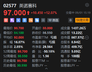 9月1日消息,英诺赛科盘中高见98.7港元再创新高,现涨超12%,成交额逾13亿港元。